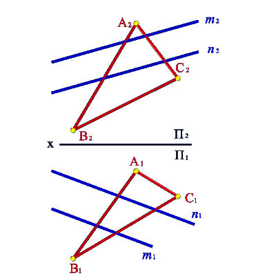 Некоторого упрощения при построении линии пересечения плоскостей можно достичь, если вспомогательные секущие плоскости проводить через прямые, задающие плоскость. В этом случае точки, определяющие положение линии пересечения плоскостей, находятся как точки пересечения прямой и плоскости. |