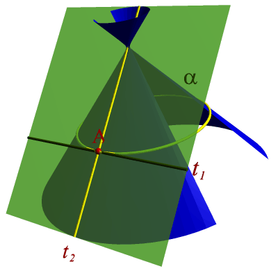 плоскость будет касаться поверхности по прямой линии – образующей. Точки,