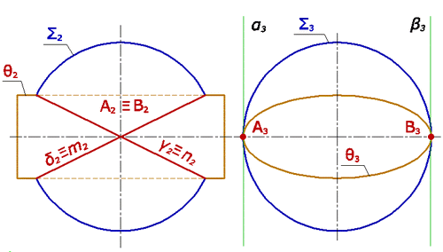 Например, по двум окружностям m и n пересекается сфера ∑ и эллиптический цилиндр Q. Точки касания и касательные плоскости обозначены соответственно через А, В, α, β. Окружности, на которые распалась линия пересечения поверхностей, расположены во фронтально проецирующих плоскостях γ и δ. |