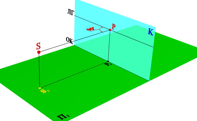 Перпендикуляр, восстановленный из точки зрения S на картинную плоскость, называется главным лучом. Точка пересечения главного луча с картинной плоскостью называется главной точкой картины и обозначается Р. Длина луча SP=S1P1 называется главным расстоянием D. Длина отрезка SS1, определяющая расстояние между предметной плоскостью и плоскостью горизонта, называется высотой точки зрения. |