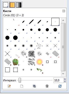 С помощью этого диалогового окна можно выбрать кисть, которая будет инструментом рисования. Кроме того, этот окно предоставляет доступ к некоторым функциям управления кистями. Интервал: позволяет указать расстояние между соседними мазками кисти при очертании мазка курсором мышки. Единица измерения — проценты от ширины кисти: от 1 до 200.