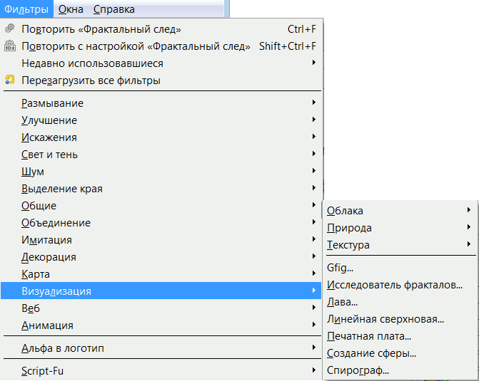 Большинство фильтров в GIMP работает над слоем, изменяя его содержимое, но фильтры в группе "Визуализация" отличаются тем, что они создают текстуры с нуля. Обычный результат работы такого фильтра — полная замена содержимого изображения. Некоторые фильтры создают случайные или шумовые текстуры, другие — фракталы, а один (Gfig) больше напоминает общий инструмент векторной графики.