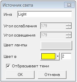 — "Параметры источника света", функция позволяет изменить такие параметры источников освещения, как название, цвет, углы ровного и рассеянного освещения для направленных источников.