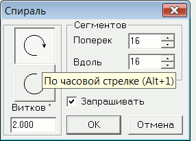 Направление закручивания спирали может быть по часовой стрелке или против часовой стрелки. Точность построения задается количеством сегментов "Вдоль" и "Поперек" контура спирали. Число витков спирали может быть нецелым. |