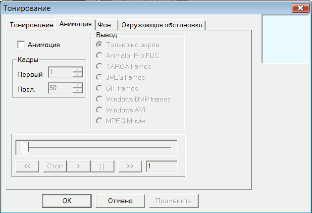 "Анимация" ─ закладка, позволяющая задать параметры тонирования анимационной последовательности кадров, управляя путем прохождения камеры, и точки прицеливания.